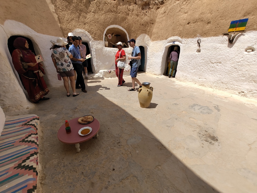 Дворик в пещере. Слева сама хозяйкаа - Мариина. На столике местное угощение - мед с лепешками.